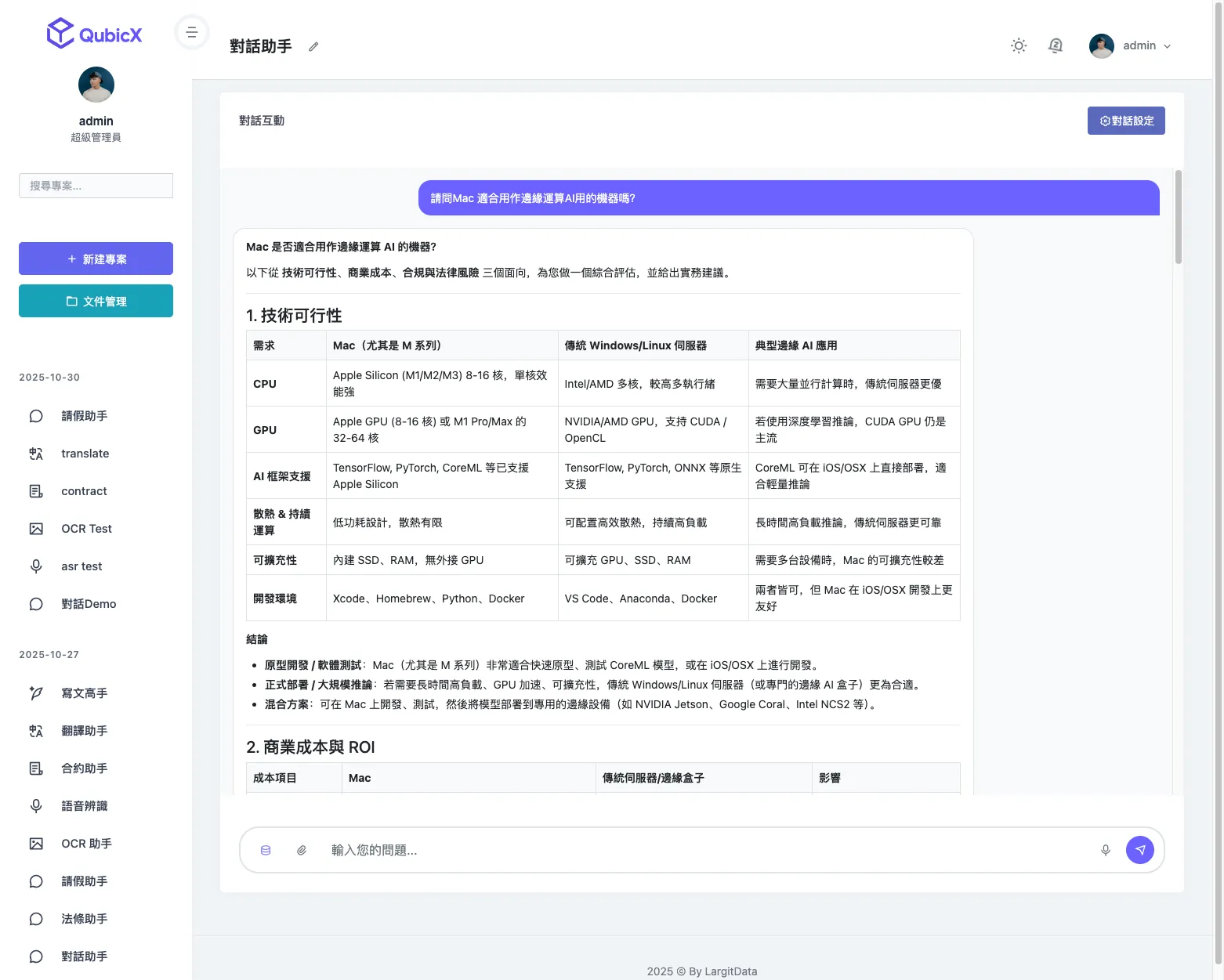 無需複雜設定,五分鐘內即可啟動專屬 AI 助理,支援文件問答、知識庫檢索、OCR、ASR等多元AI應用