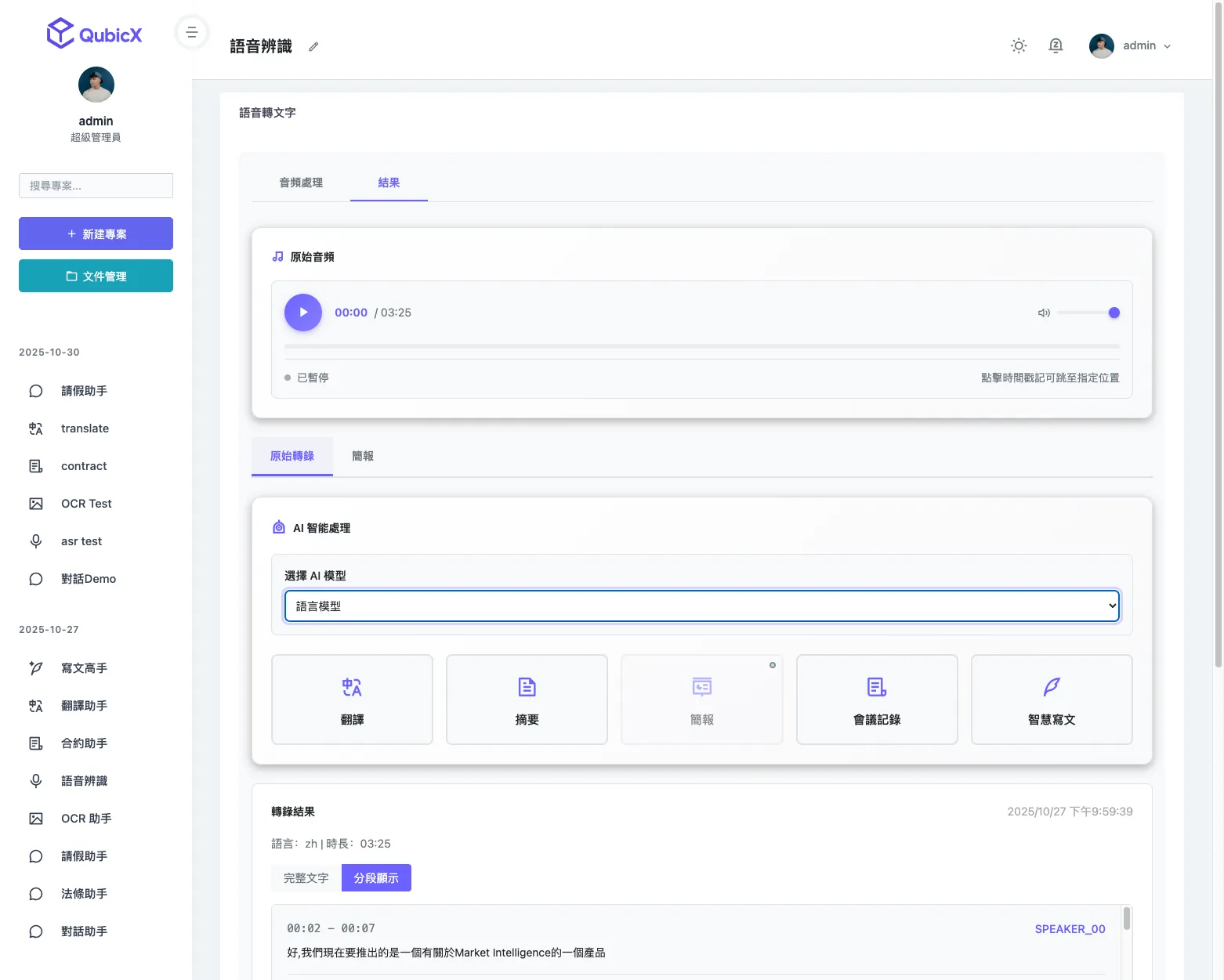 整合先進的語音轉文字技術,支援會議記錄、客服對話、語音備忘錄等多種應用場景。自動生成逐字稿並可進行摘要、翻譯等進階需求。